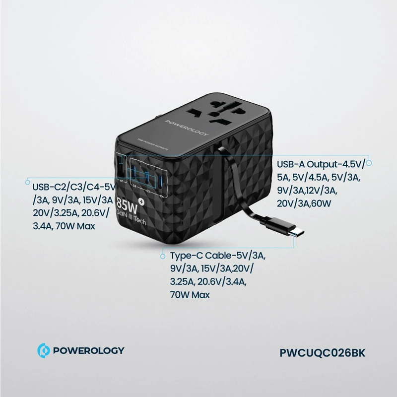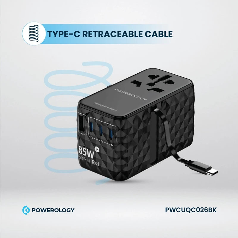 Powerology Universal GaN 85W Super Charger Retractable Type-C Cable