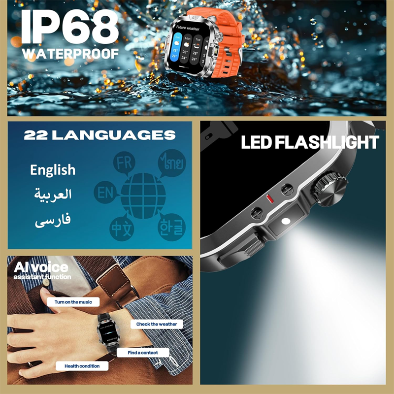 • کنترل صوتی AI و چراغ قوه LED: این ساعت دارای چراغ قوه LED قدرتمند برای روشنایی در حرکت و دستیار صوتی پیشرفته AI برای استفاده بدون دست است.