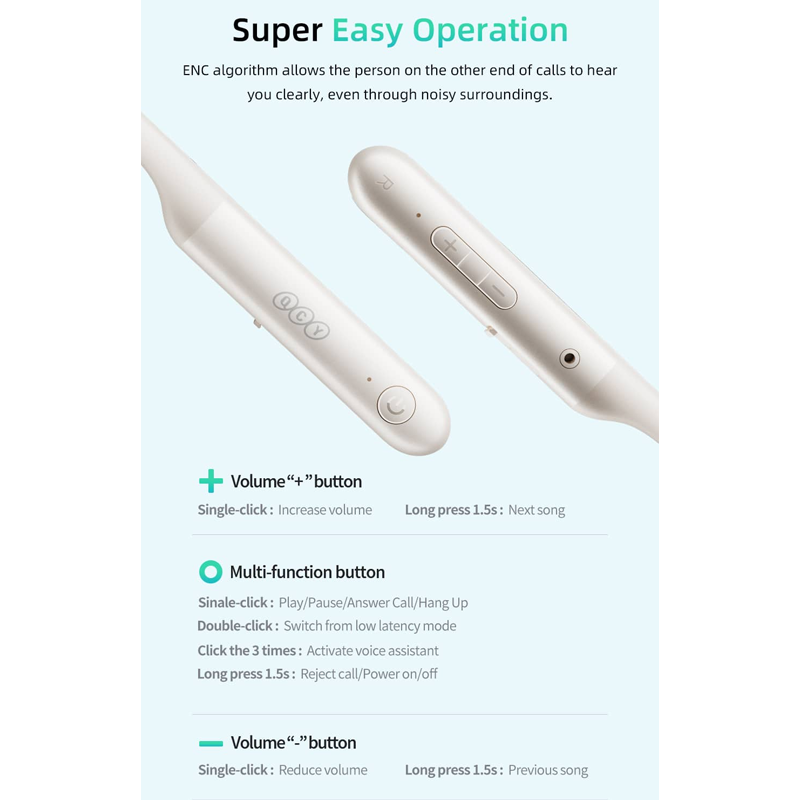QCY C2 به درایور ۱۴ میلیمتری مجهز شده است که حجم صدای بالا، بیس مناسب و تفکیک صدای رضایتبخش را ارائه میدهد. به لطف فناوری حذف نویز ENC، بخش زیادی از صداهای محیط حذف شده و مکالمات با وضوح بیشتری انجام میشود.