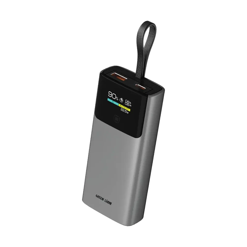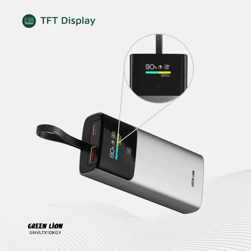 در بخش طراحی، گرین لاین Voltix عملکرد قابل قبولی دارد. بدنه خوشساخت، ظاهر مدرن و صفحهنمایش TFT برای نمایش وضعیت شارژ، تجربه کاربری را به شکل محسوسی بهبود میدهد. وجود بند نگهدارنده کابل Type-C نیز جزئیاتی است که نشان میدهد این محصول صرفاً یک پاوربانک ساده نیست و به نیازهای واقعی کاربر توجه شده است.