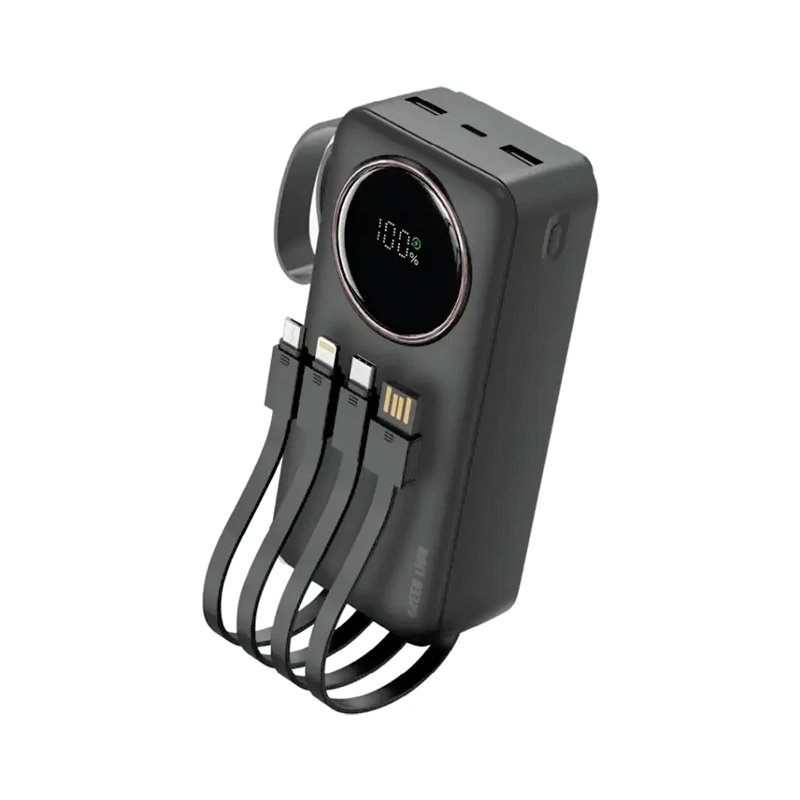 این پاوربانک مجهز به فناوری فست شارژ PD و QC با توان 22.5 وات بوده و قادر است دستگاههای شما را در کمترین زمان با بالاترین راندمان شارژ کند. وجود دو پورت خروجی USB-A، یک پورت ورودی و خروجی Type-C و همچنین سه کابل داخلی یکپارچه شامل Lightning، Micro USB و Type-C باعث میشود به هیچ کابل اضافهای نیاز نداشته باشید.